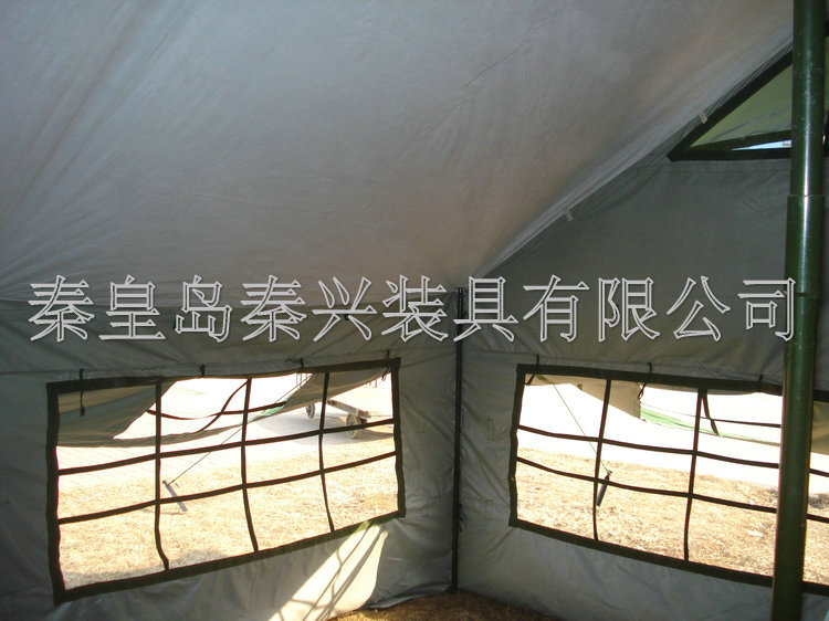 1.帳篷為雙坡面、雙層頂支桿式結構,帳篷長4.6米,寬4.6米,頂高3.1米,邊高1.4米,前山墻有一扇門一個窗,后山墻兩個窗,圍墻各兩個窗。帳篷使用面積21.16m2,包裝運輸總質量91.3kg,體積0.215m3。展開狀見圖