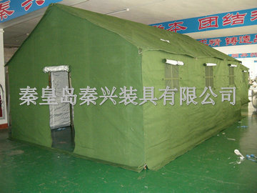 救災用 12m2單帳篷為長方形雙坡面直墻建筑樣式。開門山墻上開三角窗一個;開窗山墻開三角窗一個,方形窗一個,兩側墻各開方形窗戶兩個。側墻可支起成陽篷,整體帳篷通過拉繩拉起,用三角樁加固。符合民政部MZ/T 011.2-2010標準。